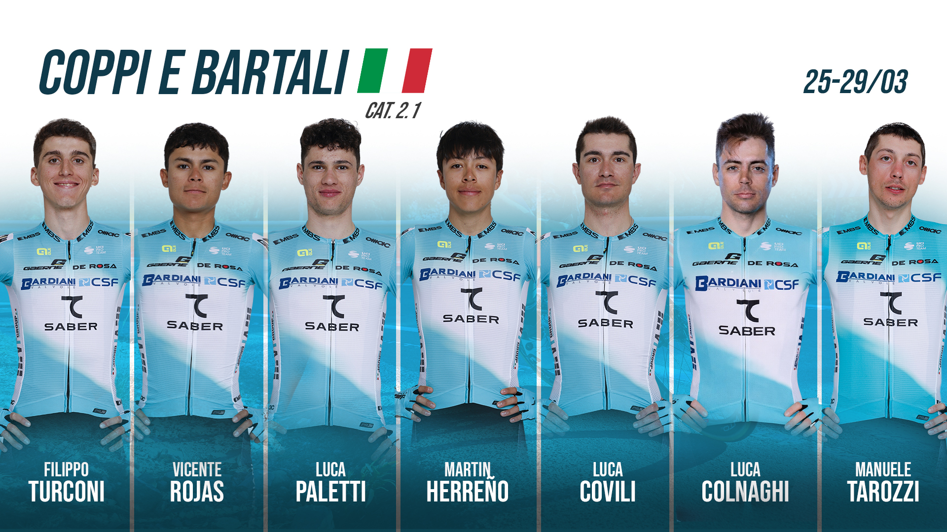 La Bardiani-CSF 7 Saber è pronta a schierarsi al via della Settimana Internazionale Coppi e Bartali, in programma dal 25 al 29 marzo, con un percorso rinnovato che abbandona l’Emilia-Romagna come fulcro tradizionale per svilupparsi più a Nord, attraversando Piemonte, Lombardia, Veneto e Friuli Venezia Giulia.
