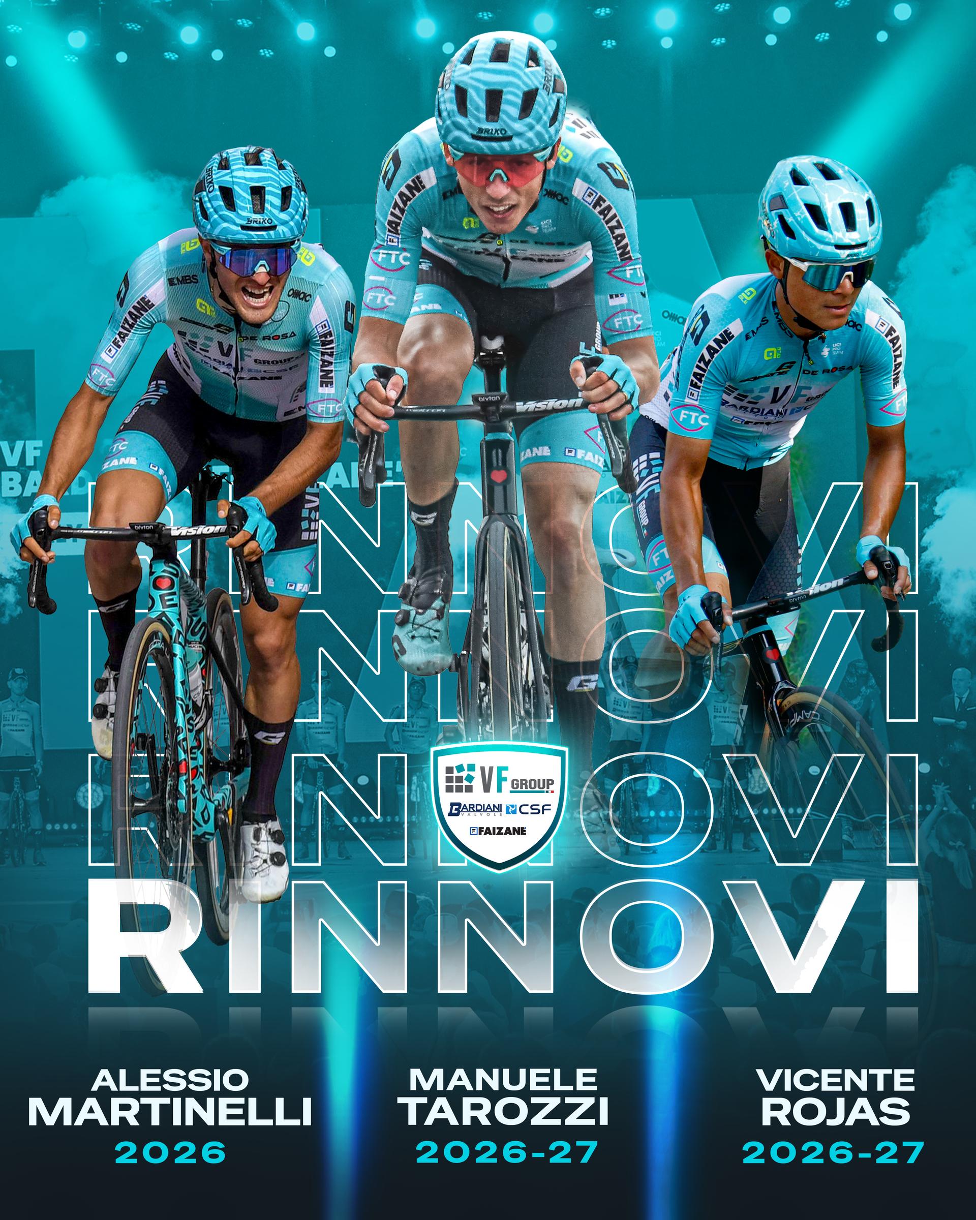 VF Group Bardiani-CSF Faizanè announces the two-year contract renewals, through 2027, of Manuele Tarozzi and Vicente Rojas, and the one-year renewal, through 2026, of Alessio Martinelli.